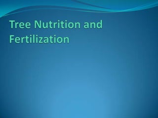 This document summarizes key topics related to soil science and tree nutrition. It discusses the components and properties of soil, including texture, structure, pH, and moisture content. Soil provides nutrients, water, and gas exchange for plant growth. The document also covers urban soil challenges, irrigation methods, and water conservation. Maintaining proper soil conditions is important for tree health.
