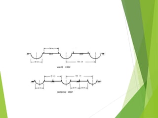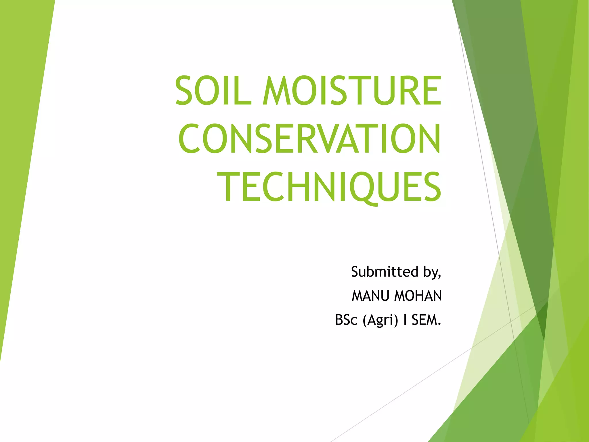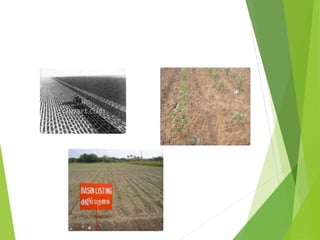 This document discusses various in-situ soil moisture conservation techniques. It introduces the topic and explains that these techniques are recommended in addition to large-scale watershed management structures to increase moisture availability for crops. The techniques aim to increase infiltration and temporarily store water at the soil surface. The document then describes several specific techniques in detail, including deep tillage, mulching, basin listing, broad-based beds and furrows, ridges and furrows, and compartmental bunding. It explains the principles and benefits of each technique for conserving soil moisture.