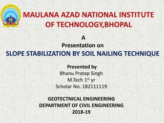 The document discusses the soil nailing technique for slope stabilization. Soil nailing involves installing reinforcing bars called nails into the slope using drilling and grouting. The nails strengthen the slope by increasing shear resistance along potential slip planes and reducing driving forces. Key elements of a nailed structure include steel nails, centralizers, grout, nail heads, and facings. Construction involves excavating and drilling nail holes before installing and grouting nails. Soil nailing is used to stabilize slopes, excavations, and retaining walls, offering advantages like rapid construction and flexibility. Design considerations include nail spacing, inclination, length, and pattern. A case study describes using soil nailing to stabilize an embankment slope at a reservoir.