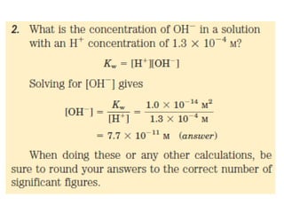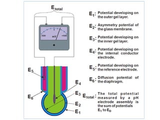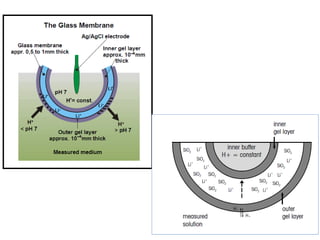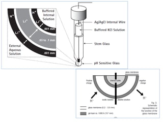 1) A pH meter works by measuring the potential difference between a glass electrode that responds to hydrogen ion concentration and a reference electrode with a known potential. The glass electrode selectively binds hydrogen ions, generating a potential based on the H+ concentration difference across the membrane.