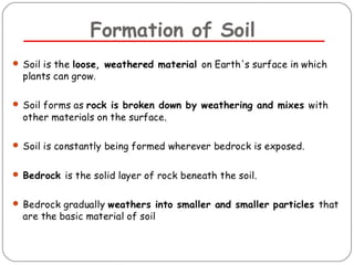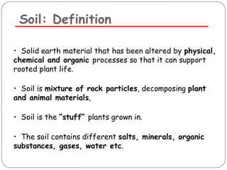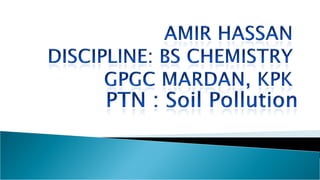 The document discusses seven primary sources of soil pollution including industrial waste, agricultural practices, biological agents, mining, radioactive pollutants, acid rain, and urban waste, detailing their harmful effects on soil quality and health. It highlights the consequences of soil contamination on fertility, human health, and ecosystems, emphasizing issues like heavy metal toxicity and the persistence of pesticides. Remediation technologies such as oxidation, ion exchange, and soil washing are also outlined as methods for addressing soil pollution.