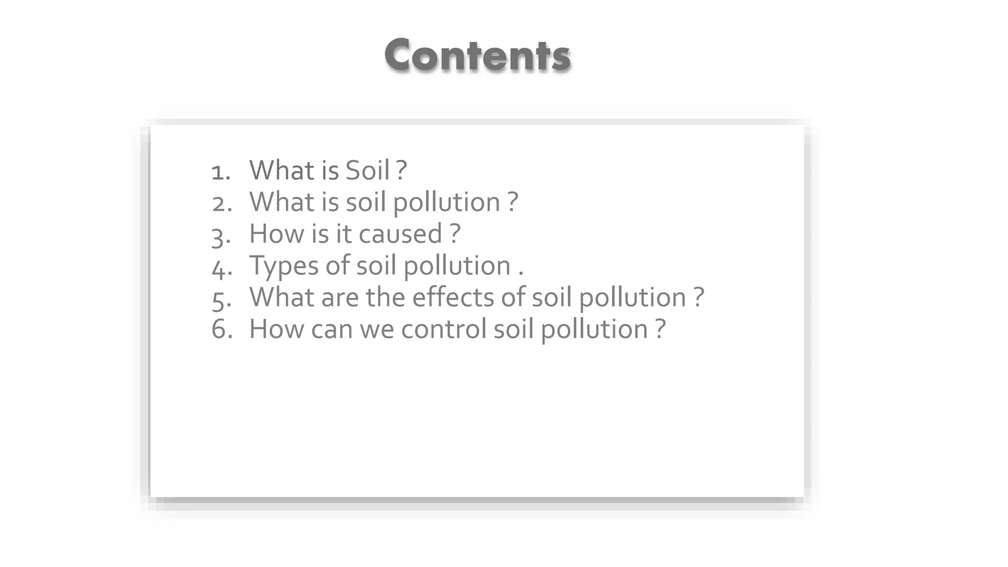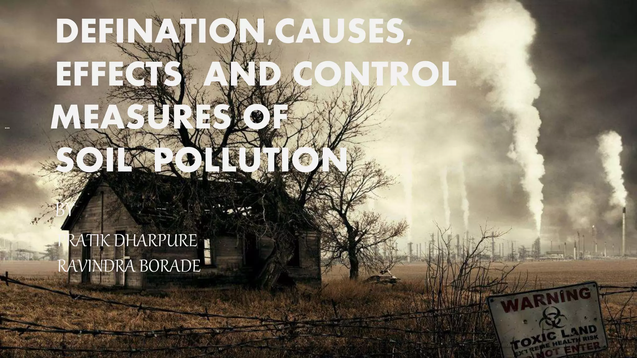 Soil pollution occurs when soils become contaminated by man-made chemicals or other alterations that negatively impact soil health and ecosystem viability. The document outlines key causes like industrial waste dumping, excessive fertilizer and pesticide use, and urban waste disposal. Effects include reduced soil fertility, crop yields, and water quality as pollutants spread. Control methods center around reducing chemical usage, properly disposing of wastes, encouraging plant growth, and implementing soil conservation practices.