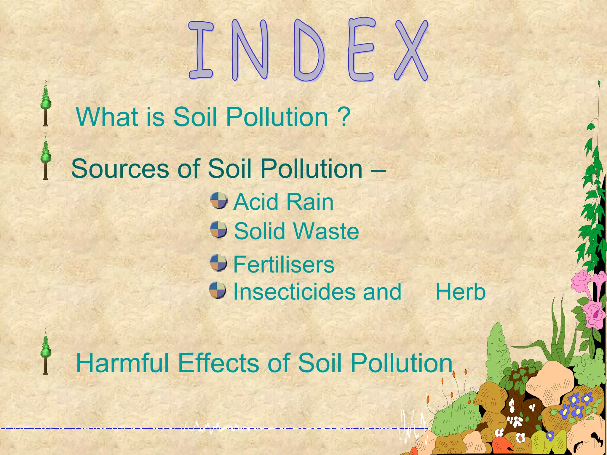 This document discusses soil pollution, its causes and effects. The main causes of soil pollution are acid rain, solid waste, excess fertilizers, and insecticides/herbicides. Soil pollution harms the environment and reduces crop yields by making the soil acidic or alkaline. Prevention methods include proper waste disposal through landfills, recycling, composting, and incineration.