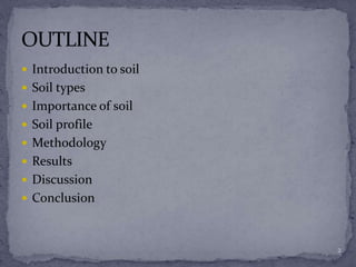 The document presented findings from a study on soil types and properties. It began with an introduction to soil and discussed major soil types based on texture. It described the methodology used, which involved examining soil profiles, measuring pH, moisture content, and organic matter. The results showed that in the grassland sample area, the topsoil had higher moisture content and organic matter than the subsoil. Meanwhile, the woodland sample area had lower levels of moisture and organic matter overall. The conclusion was that various soil properties, like pH, were similar between areas, but factors like location affected moisture content and organic matter levels.