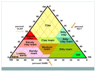 The document summarizes key information about soil resources. It defines soil and discusses soil-forming factors such as parent material, climate, topography and organisms. It also describes soil composition, nutrients, horizons, texture, characteristics, types of fertilizers and their pros and cons. Methods to prevent soil erosion, salinization, desertification and reclaim degraded land are also summarized.
