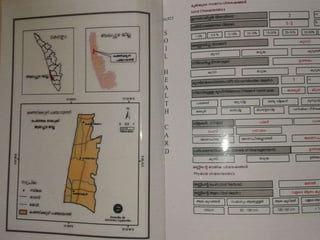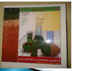 The document discusses soil health management in Kerala. It notes that soil health cards are provided to farmers to evaluate soil quality based on physical, chemical and biological characteristics. The cards are intended to help farmers monitor soil health and make informed management decisions. They provide information on soil type, nutrients, pH, and recommendations to improve soil quality. The overall goal is to support sustainable land management and increase agricultural productivity.