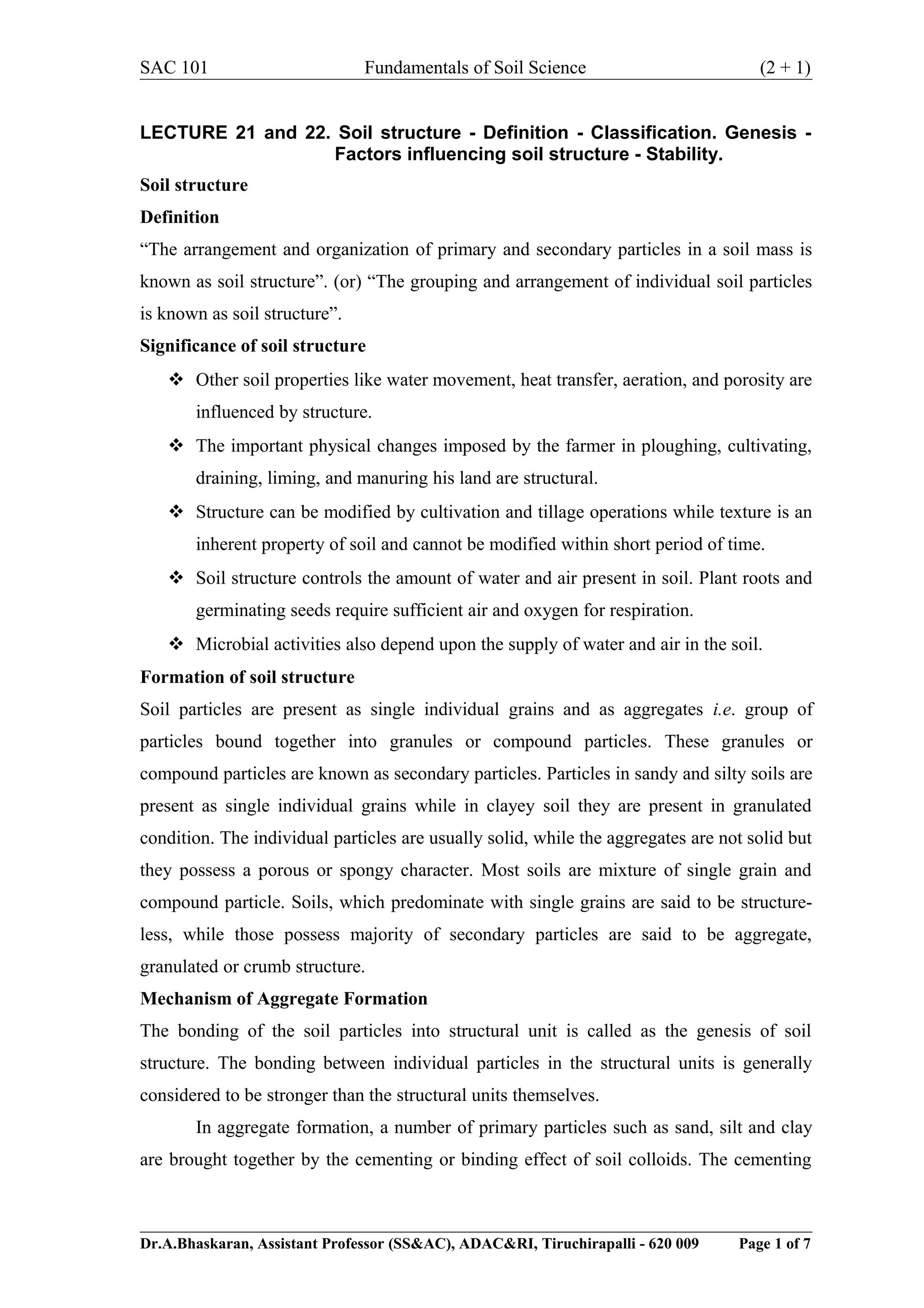 This document discusses soil structure, including its definition, significance, formation, classification, and factors affecting it. Soil structure refers to the arrangement and grouping of individual soil particles. It is significant as it influences properties like water movement, aeration, and porosity. Soil structure is formed through the binding and cementing of primary particles into aggregates or secondary particles. Aggregates are classified based on their type (shape), class (size), and grade (distinctness). Factors like climate, organic matter, and tillage influence the development of soil structure.