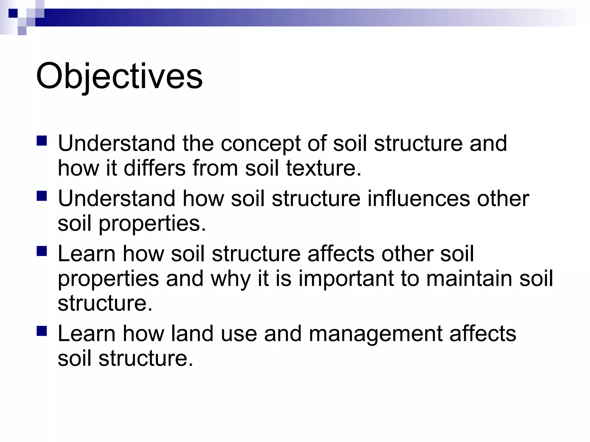 This document discusses soil structure, including the definition of soil structure as the arrangement of primary soil particles into aggregates called peds. Different types of soil structures are described such as granular, blocky, prismatic, and massive. Soil structure influences properties like density, porosity, permeability and strength. Good soil structure facilitates water and air movement while poor structure restricts it. Soil structure can be altered by tillage or compaction, which can break down natural aggregates. Bulk density, porosity and their relationship to particle density are also covered.