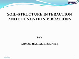 This document discusses soil-structure interaction and foundation vibrations. It begins with an introduction to soil-structure interaction, noting that the response of the soil influences the motion of the structure and vice versa. It then discusses how soil-structure interaction can alter the natural frequency and add damping to a structural system. The document outlines different effects of soil-structure interaction and how it is an important consideration in seismic analysis and design. It also discusses impedance functions, compliance functions, and modeling of machine foundation vibrations.