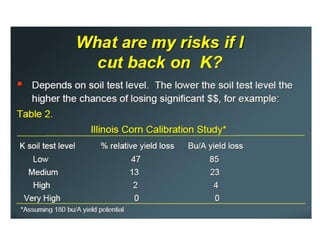 The document discusses the goals, methods, and considerations for routine soil testing, including collecting representative soil samples, using appropriate sampling techniques and numbers of samples, analyzing samples for nutrient levels, and interpreting results to make meaningful fertilizer recommendations through calibration of soil test levels to crop yields. Routine soil testing aims to provide rapid, inexpensive, and broadly applicable analysis to predict crop nutrient needs.
