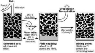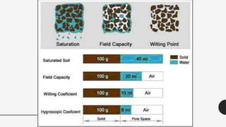- Moisture constants like field capacity and permanent wilting point define the range of available water for plants