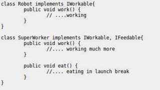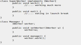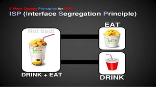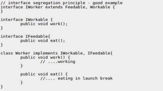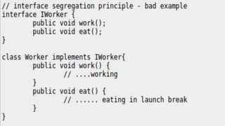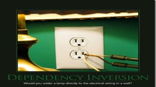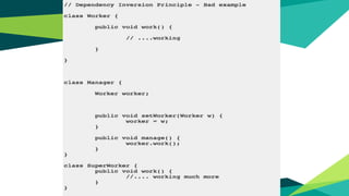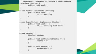 The document outlines key software design principles to avoid poor design, including the single responsibility principle, open/closed principle, liskov's substitution principle, interface segregation principle, and dependency inversion principle. Each principle is explained along with its benefits and potential violations, emphasizing concepts like cohesion, coupling, and the need for decoupling high-level and low-level modules. The document also highlights important quality attributes of design principles such as understandability, changeability, extensibility, reusability, testability, and reliability.