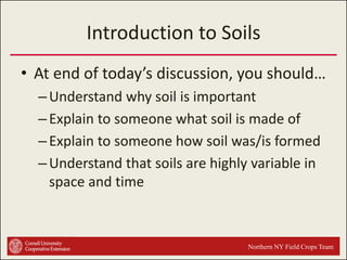 This document provides an introduction to soils. It explains that soil is formed over long periods of time through the weathering of parent materials influenced by climate, organisms, topography, and time. Soil is made up of minerals, organic matter, air, and water. It varies widely in different locations due to differences in these forming factors. Soil serves important functions such as growing plants, regulating water and nutrients, and providing habitat. Understanding soils is essential because nearly all life on earth depends on the various functions soils provide.