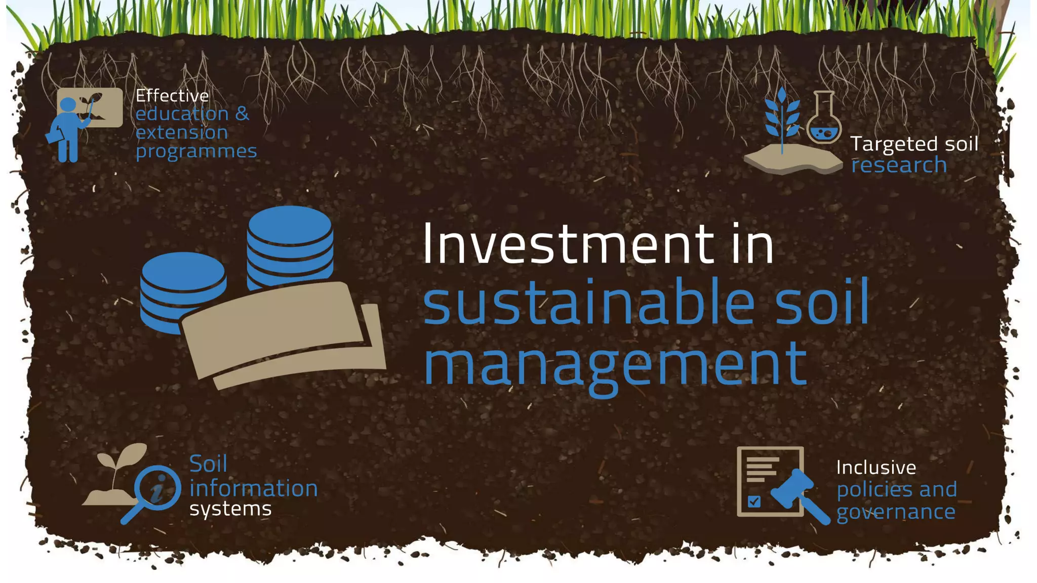 The document emphasizes the importance of sustainable soil management, including investment, education, and policy, building on the legacy of the International Year of Soils (IYS). It outlines specific targets for improving land and soil quality by 2030, including reducing pollution and restoring degraded lands. The document also highlights the need for collaboration in achieving these sustainability goals.