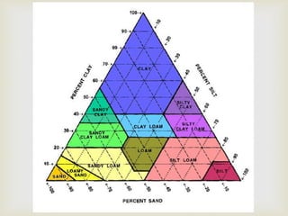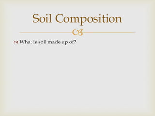 This document provides an overview of soil composition and formation. It states that soil is composed of 5% water, 25% air, 45% mineral matter, and 25% organic material. Soils are formed through weathering of bedrock and incorporation of organic material via plant and animal remains. Soil profiles consist of horizontal layers (horizons) that indicate soil type and development. Key soil characteristics include color, structure, texture, organic content, pH, and water content, which influence a soil's ability to support plant growth.