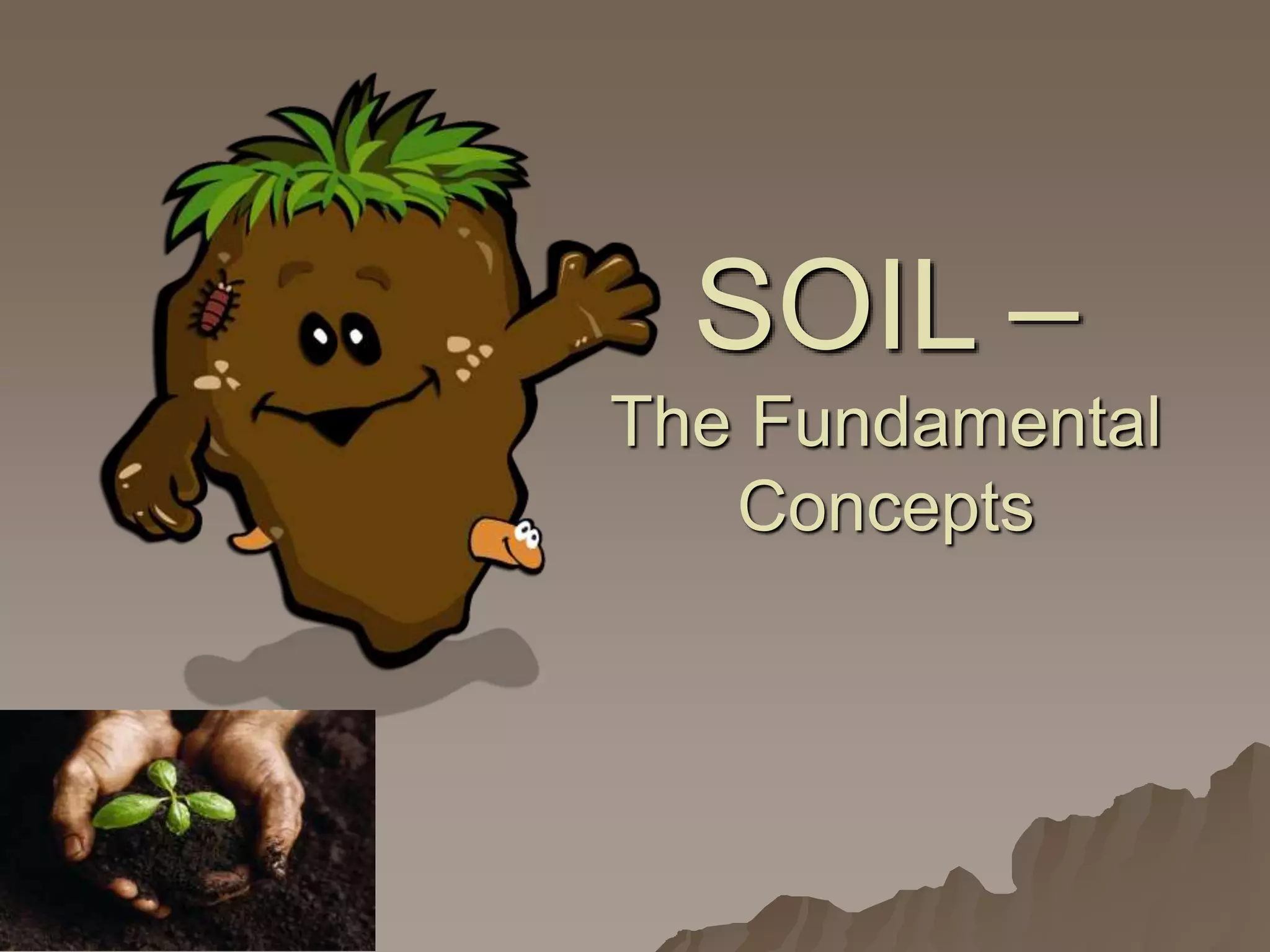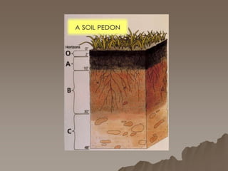 The document discusses the key components of soil, including minerals, water, air, organic matter, and microorganisms. It defines soil based on its geologic, traditional, taxonomic definitions. Soil is made up of horizons like O, A, E, B, C. Factors like parent material, climate, organisms, topography, and time affect soil formation. The document also outlines different types of soil structures and the 12 orders of soil geography.