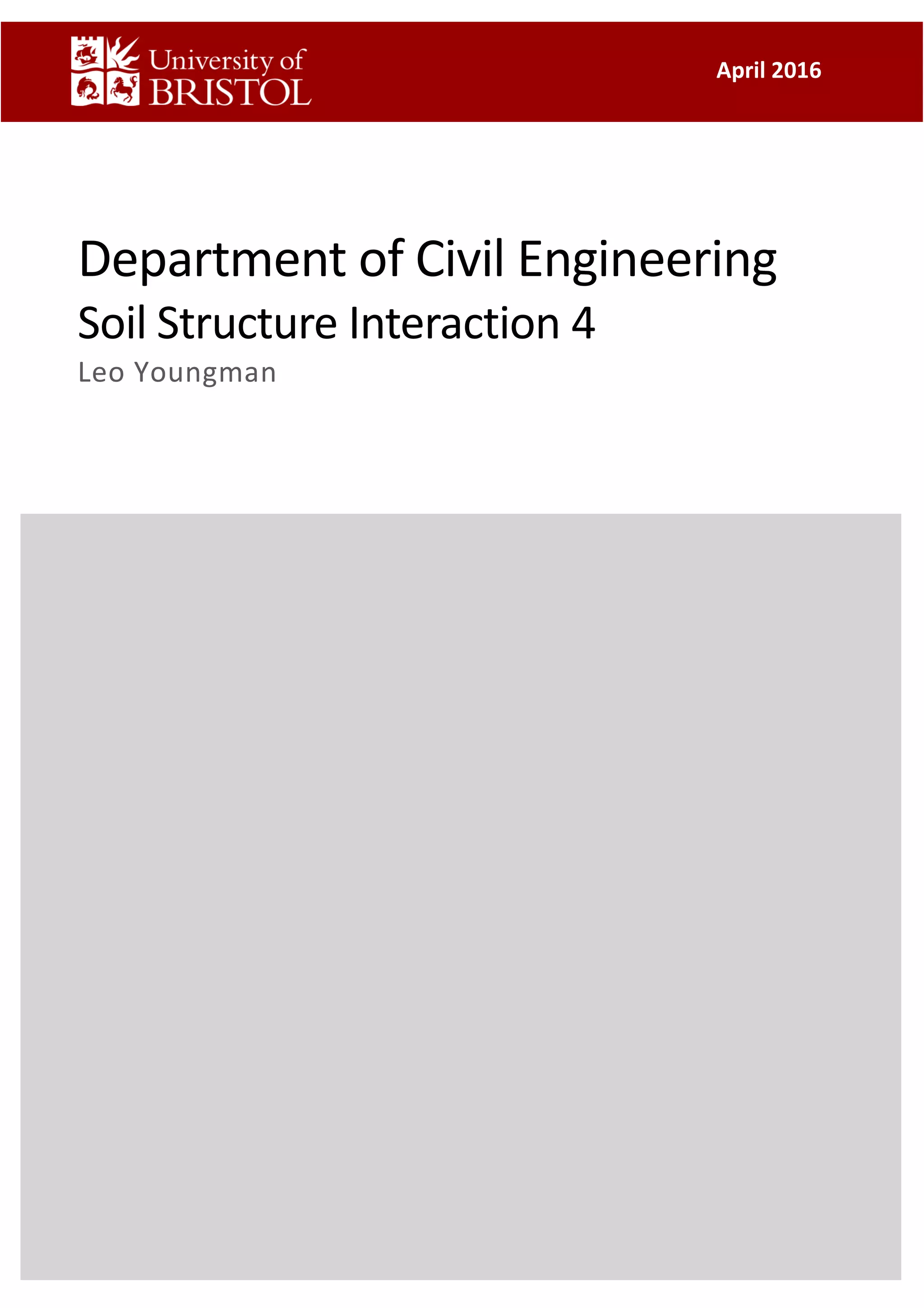 This document is a study report on using finite element modeling (PLAXIS) to analyze soil-structure interaction. The report contains initial studies comparing PLAXIS results to hand calculations on bearing capacity and settlement of foundations. Key findings from the initial studies include: 1) Mesh refinement near the footing improves accuracy more than general refinement; 2) Boundaries should be at least 1-2 times the footing width away; 3) PLAXIS predicts undrained capacity and settlement well but overestimates drained capacity. The report then analyzes a foundation problem and excavation problem in PLAXIS.