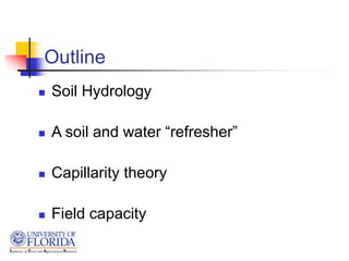 3) Field capacity refers to the amount of water held in a soil after excess water has drained away due to gravity, but capillary forces are still holding some in the smaller pores. It varies by soil texture and structure.