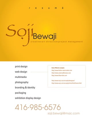 Soji Bewaji is a creative director and art director with over 21 years of experience in visual communication design, including 5 years in web design and 16 years in print design and advertising. He is seeking a senior art director position where he can lead creative teams and oversee design projects from concept to completion while ensuring quality and adherence to branding. He has extensive experience managing teams and projects at various agencies and companies, including Canadian Tire.