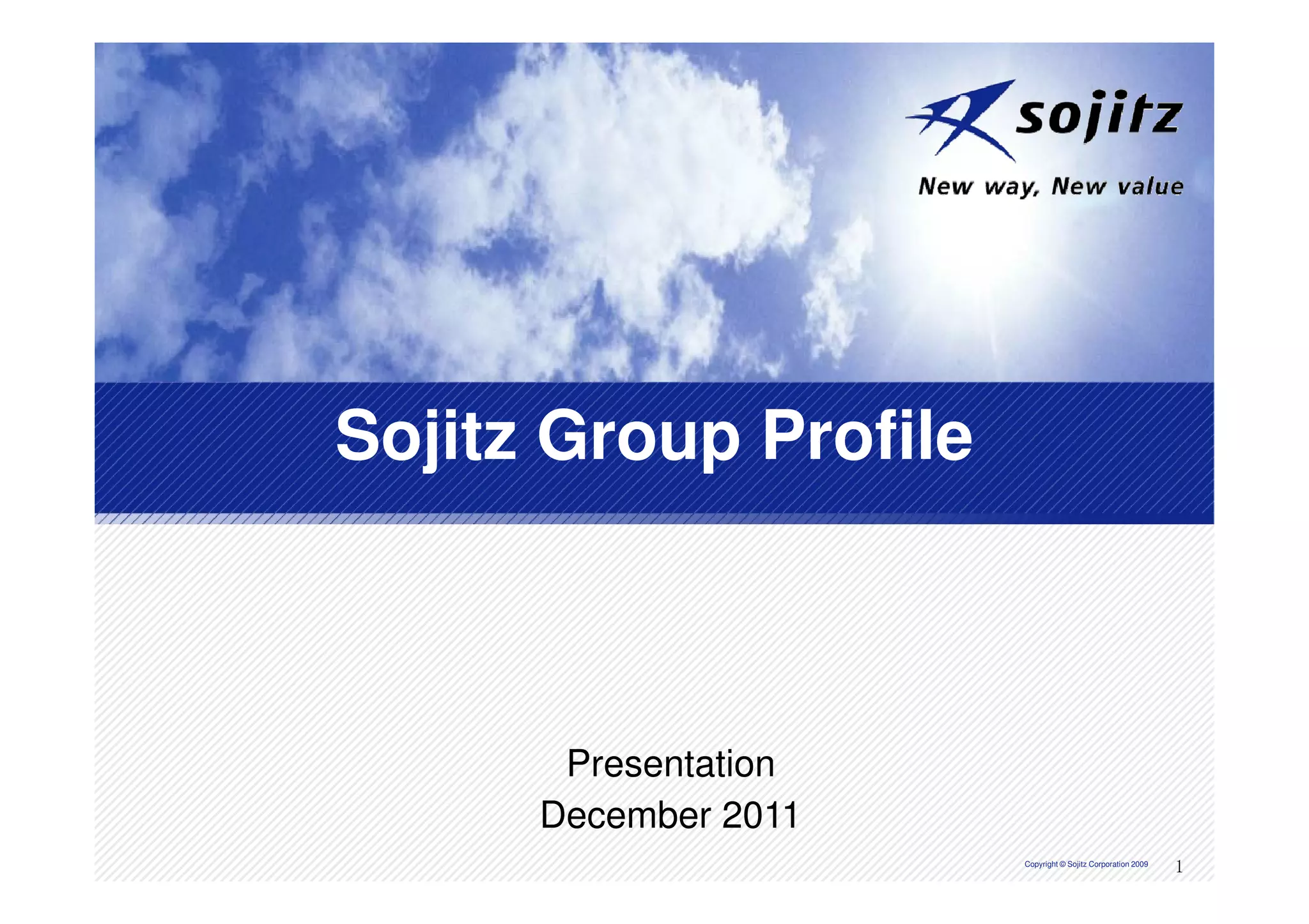 The Sojitz Group is a functionally oriented general trading company aiming to enhance its trading functions, innovate business fields, and promote employee development while being socially responsible. As of March 31, 2011, Sojitz operates in approximately 50 countries with a diverse portfolio across machinery, energy, chemicals, and consumer lifestyle sectors. The company emphasizes corporate social responsibility through initiatives like sustainable energy production and support for local communities.