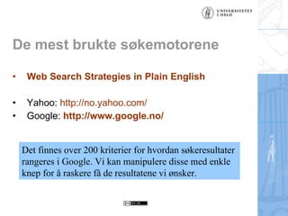 De mest bruktesøkemotorene Web Search Strategies in Plain English Yahoo: http:// no.yahoo.com / Google: http:// www.google.no / Det finnes over 200 kriterier for hvordan søkeresultater rangeres i Google. Vi kan manipulere disse med enkle knep for å raskere få de resultatene vi ønsker.