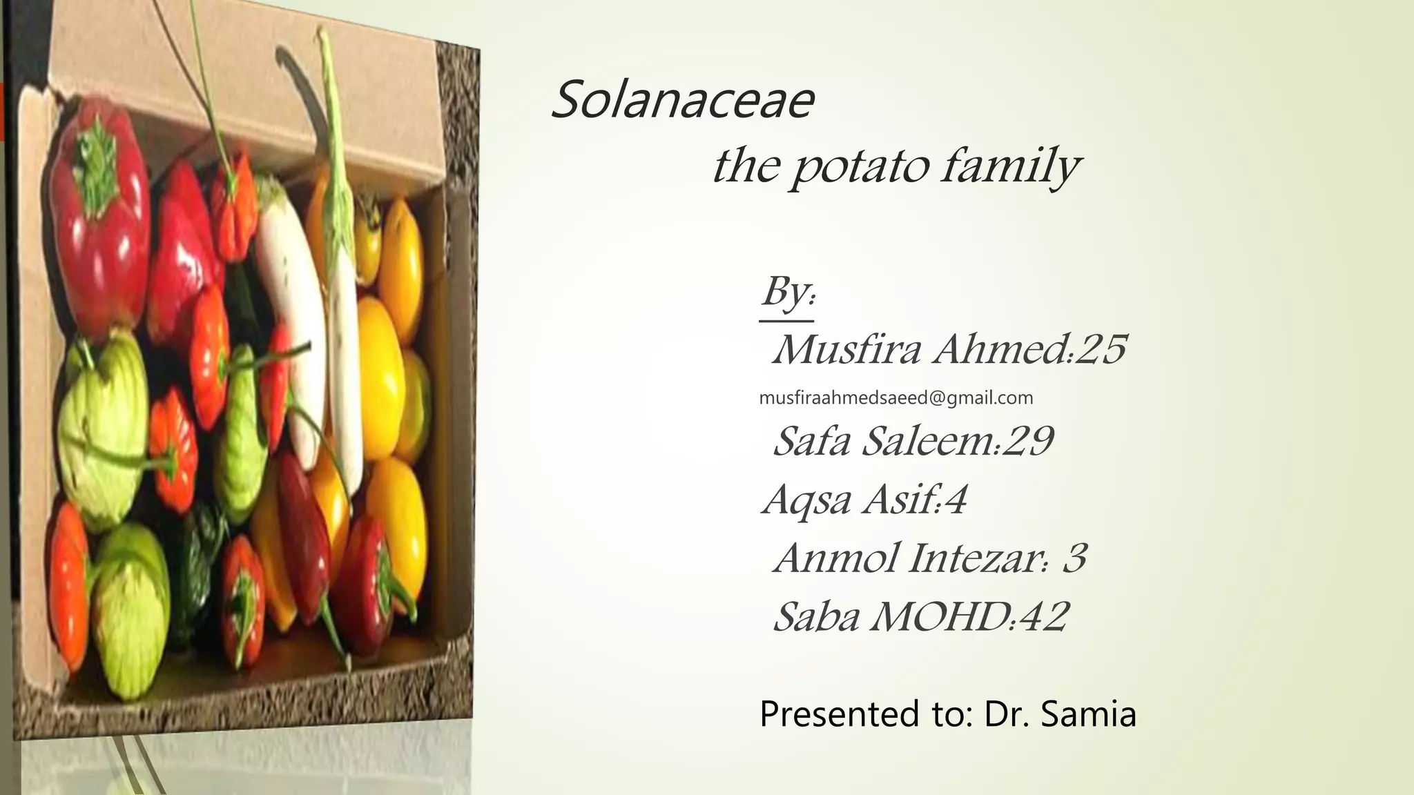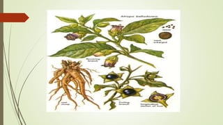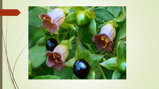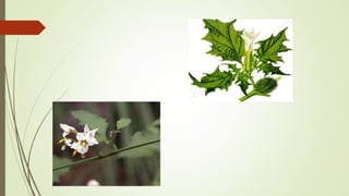 The document provides information about the Solanaceae family, also known as the potato family. It discusses key details about the family, including that it contains around 90 genera and 2000 species of flowering plants. 14 genera and 52 species are found in Pakistan. Common features among members include herbs, shrubs, vines with simple leaves and bisexual flowers. Many members are used for their alkaloid content, as ornamentals, medicines, and some are edible or toxic weeds. Examples like belladonna, henbane, jimsonweed, and peppers are described in more detail.