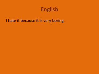 This student enjoys mathematics and science but finds English, computers, and Hindi less engaging - they hate English because it is boring, find computers the most boring subject studied, and don't like Hindi, though they like French.