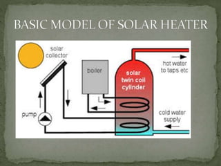The document discusses solar cookers and solar water heaters. It explains that solar cookers use sunlight to cook food through concentration, absorption, and retention of heat. They are inexpensive and do not require fuel. Solar water heaters also make use of solar energy by using collectors to absorb heat from the sun and transfer it to water stored in tanks. There are active and passive types, with active using pumps and passive relying on convection. Both solar cookers and water heaters help reduce pollution by making use of a renewable energy source.