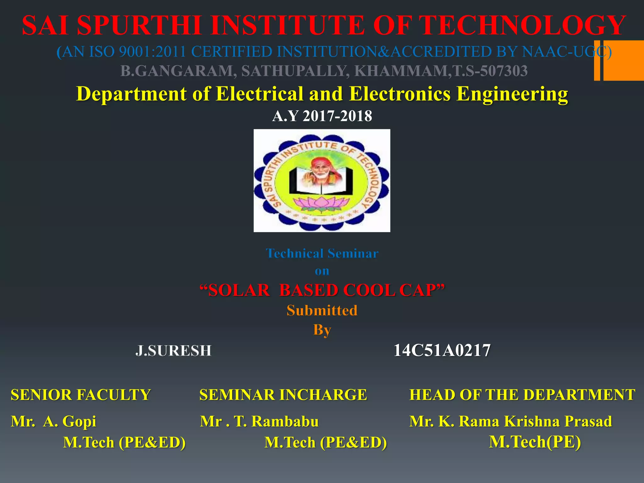 This document describes a solar-powered cooling cap. It contains a solar panel that charges a battery to power a fan for cooling. When the temperature rises, the fan automatically turns on. It lists the components, provides a block diagram of the system, and describes how it works. Potential advantages are discussed such as being environmentally friendly and preventing sunstroke. Disadvantages include only working during the day and heavy batteries. Applications include sports, commercial use, and fishing. In conclusion, solar cooling is an efficient way to use renewable energy for air conditioning needs.