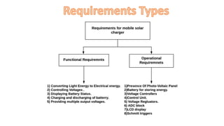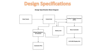 The document discusses a solar-based mobile charger that addresses the need for portable mobile charging, particularly in areas without access to electricity. It highlights the advantages of solar energy as a renewable resource, detailing the system's components such as a rechargeable battery, voltage regulators, and an analyzer circuit with an LCD display to monitor battery status. This innovative solution allows for the charging of various low-voltage devices while promoting environmentally friendly energy use.