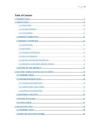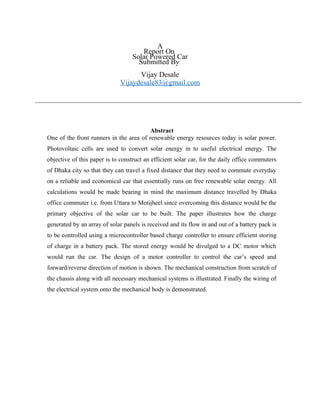 The document discusses the design and construction of a solar-powered car intended for daily commuters in Dhaka City, aiming to reduce pollution and fuel costs by utilizing renewable solar energy. It details the project's objectives, including calculations for motor power, battery capacity, and solar panel specifications to ensure the car can cover necessary distances reliably. The report also highlights the essential components and systems, such as solar panels, batteries, charge controllers, and mechanical parts, necessary for building a functional prototype.
