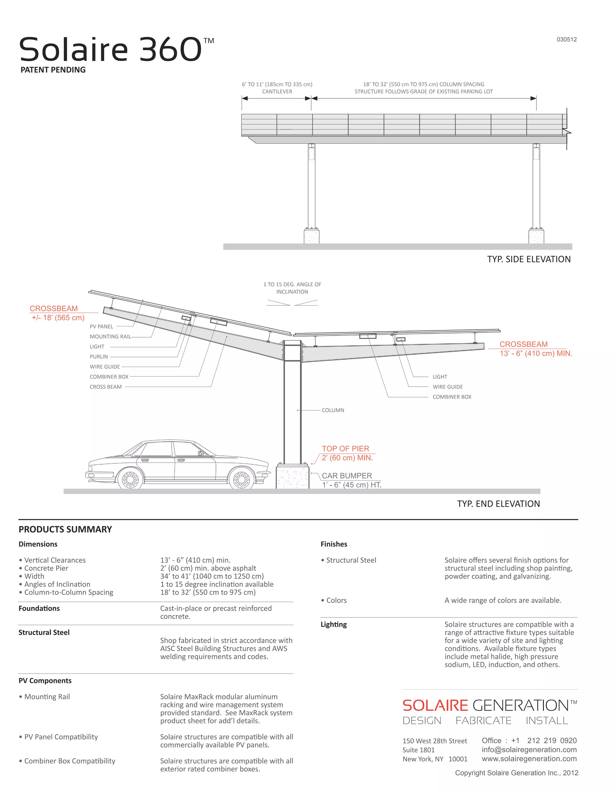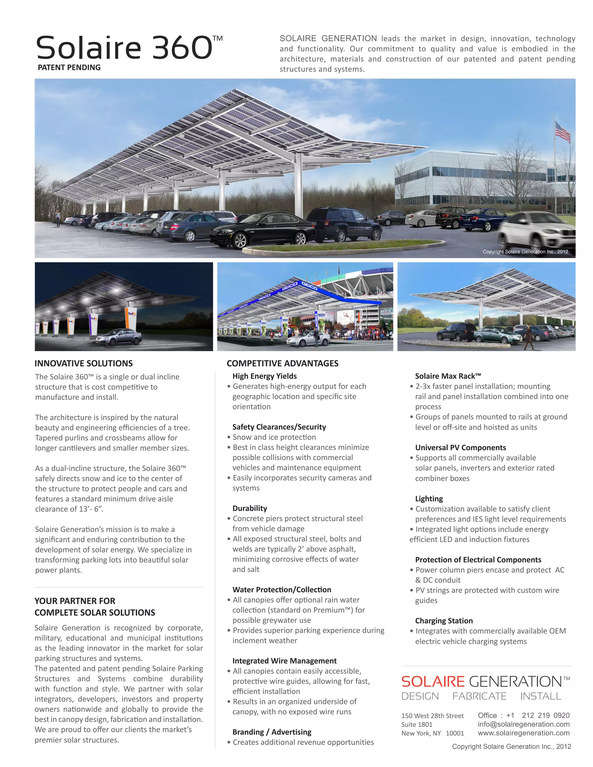 Solaire 360 is a patented solar parking structure developed by Solaire Generation. It uses an innovative dual-incline design inspired by trees to efficiently generate solar energy while directing snow and ice away from vehicles. The structures are cost-competitive to manufacture and install, and provide benefits like high energy output, safety, durability, and optional integrated lighting and electric vehicle charging. Solaire Generation partners with customers to provide complete solar solutions using their premium structures.