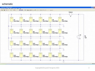 This document discusses simulating the output of solar cells using LTspice software. It describes a solar cell made by Honda Kaihatsu, model number HEM125PA, that uses 24 parallel connections. The document includes the schematic for the simulation and results showing the voltage-current and voltage-power curves of the solar cell output. Simulation data from LTspice is also provided.