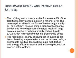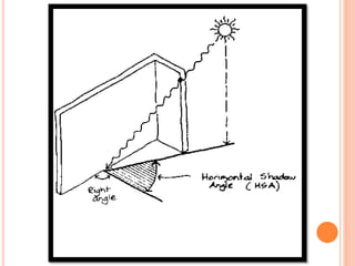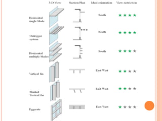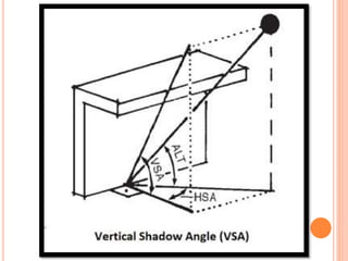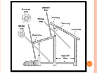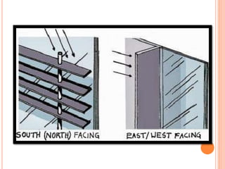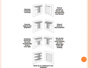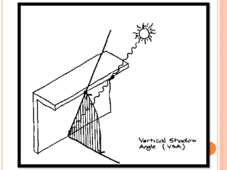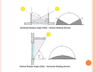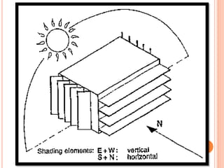 This document discusses solar control and passive solar design strategies. It explains that buildings are responsible for 40% of energy consumption and outlines how passive solar design and energy efficient technologies can reduce this. It then discusses the importance of solar control and different types of shading devices that can be used both exterior and interior to a building to control solar gain. These include landscaping features, overhangs, light shelves, low-e glass, and interior devices like blinds. The positioning of the sun is also explained through diagrams and the effect this has on shading design is covered.