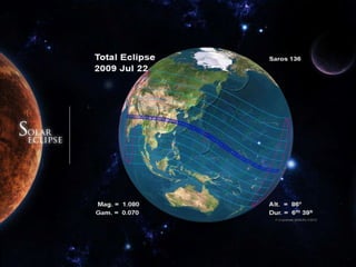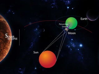 A solar eclipse occurs when the moon passes between the Earth and the sun, blocking the sun's light. There are typically 2-5 solar eclipses per year. There are four types of solar eclipses: total, annular, partial, and hybrid. A total solar eclipse, where the moon completely blocks the sun's light, occurs on average every 18 months and can only be seen from a narrow path on Earth. The longest total solar eclipse of the 21st century occurred on July 22, 2009 and lasted over 6 minutes. Special care must be taken to safely observe a solar eclipse by using eclipse glasses or other filters to view the sun.