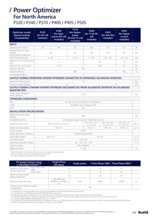 The document summarizes SolarEdge's Power Optimizer, which is designed to work with SolarEdge inverters. It allows for up to 25% more energy production compared to traditional solar systems. The Power Optimizer provides module-level voltage shutdown for safety and monitoring. It comes with a 25-year warranty and is compatible with all SolarEdge single and three phase inverters.