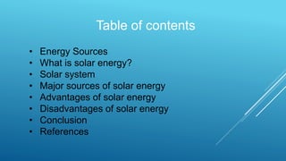 This document summarizes solar energy, including its sources, advantages, and disadvantages. Solar energy is radiant light and heat from the sun that can be harnessed using technologies like solar heating and photovoltaics. There are two main types of solar energy systems: active systems that use solar energy to heat a fluid and rely on backups, and passive systems that operate without external sources by collecting solar energy through south-facing windows. Major uses of solar energy include daylight, drying agriculture products, space heating, water heating, and generating electricity through concentrated solar power and photovoltaics. While solar energy is clean, sustainable and free, its equipment can be inefficient and costly, it is only part-time, and reliability depends