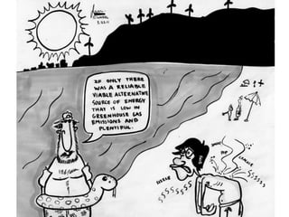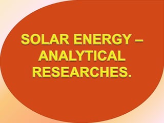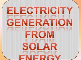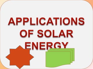 The document discusses solar energy, including its sources, applications, and advantages over other energy sources. It describes how solar energy from the sun is captured and converted into usable forms of energy such as heat and electricity. Solar energy can be used to generate power, heat water, power vehicles and satellites, and for applications in architecture, agriculture, and water treatment. It has advantages over fossil fuels in being renewable and pollution-free, and over nuclear energy in being safer with no radioactive waste. While intermittent, solar energy has great potential to meet the world's energy needs if methods of efficient collection, conversion, storage and use are improved.