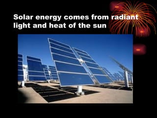 Solar energy comes from sunlight and can be transformed into electricity or heat. People have harnessed solar energy since ancient times for warmth, and solar panels have been used to convert sunlight into electricity since 1876. Spain has significant solar potential due to its sunny climate and has become one of the top producers of solar energy worldwide, with solar power meeting 2.8% of the country's electricity demand in 2009. While solar energy has advantages like being renewable and carbon-free, it also has disadvantages such as only working when the sun is shining and some areas not receiving much sunlight.