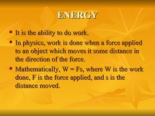 Solar energy is the conversion of sunlight into electricity or heat. It is a renewable and non-polluting energy source. Solar energy can be captured using photovoltaic cells or concentrated solar power systems and has many applications including generating electricity, heating water, drying crops, and powering vehicles. While solar energy has high initial costs, it has benefits such as being renewable, producing no emissions, and allowing energy production in remote areas not connected to power grids.