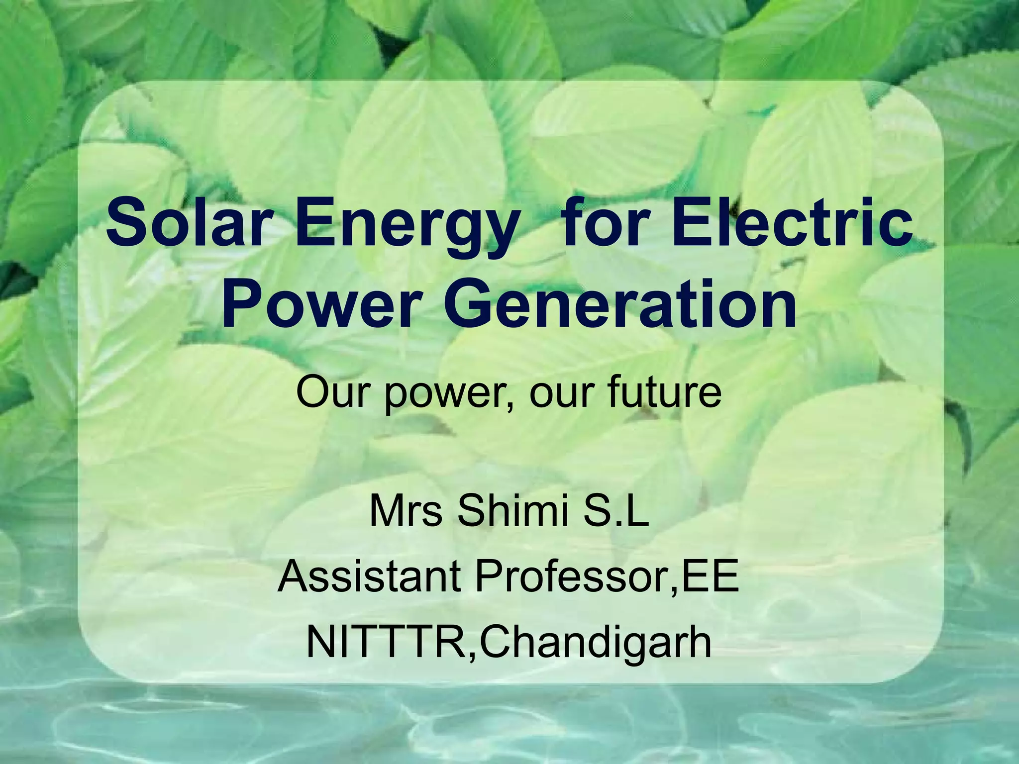 The document discusses various topics related to solar energy generation including: