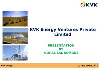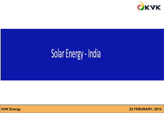 The document appears to be a presentation on solar energy given by Gopal Lal Somani of KVK Energy on February 22, 2012. It discusses India's national energy scenario, the progress of grid-connected solar power projects, results of the National Solar Mission Phase I bidding, and the anticipated growth of solar power capacity in India. It also examines cost trends and predictions that solar energy could achieve grid parity by 2015-2017.