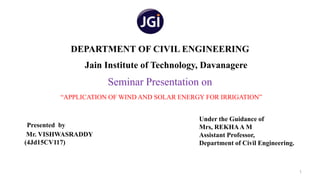 The document details a seminar presentation on the application of wind and solar energy for irrigation, highlighting the challenges faced by farmers due to electric supply constraints. It outlines the objectives, benefits, and drawbacks of utilizing these renewable energy sources, as well as a case study demonstrating their effectiveness in Bihar, India. The conclusion emphasizes the economic and environmental advantages of implementing renewable energy irrigation systems.