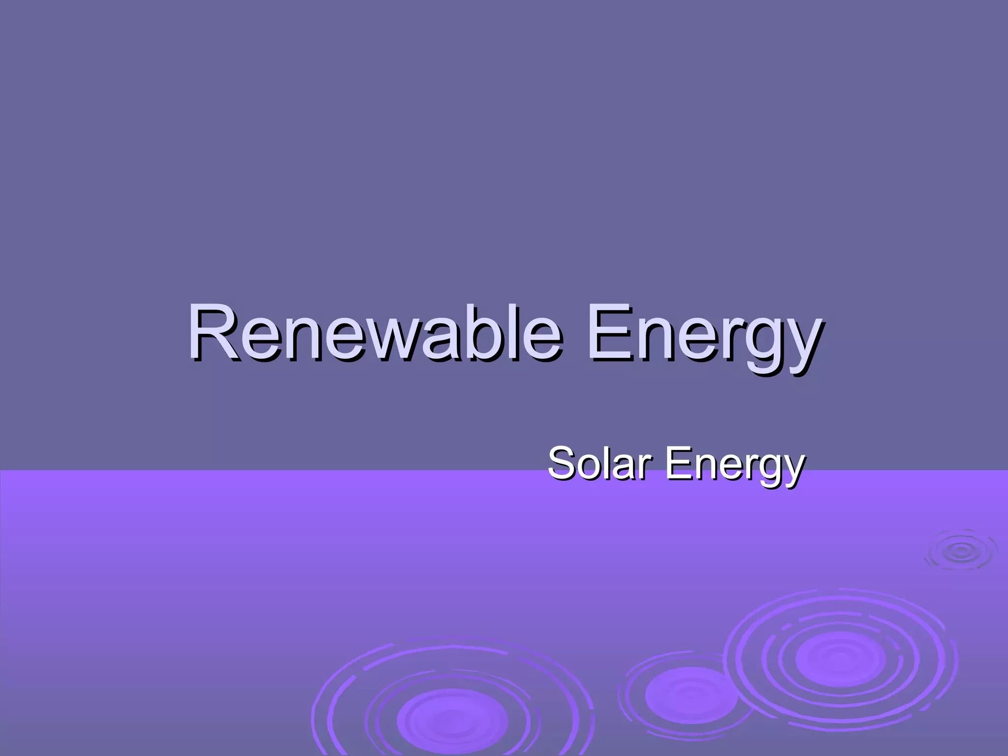 This document discusses renewable and non-renewable energy sources, focusing on solar energy. It defines renewable energy as coming from naturally replenished resources like sunlight, wind, and tides. Solar energy harnesses radiant light and heat from the sun using technologies like solar heating and photovoltaics. While solar energy is sustainable and has environmental benefits by not producing pollution, manufacturing solar panels requires energy and produces waste, and solar technology is currently inefficient and expensive compared to fossil fuels. The document also discusses the economic, social, and potential impacts of solar energy.