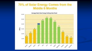 The document discusses the benefits of solar energy as a renewable resource. It states that solar energy has the potential to meet humankind's total energy demand given that the amount of solar energy that reaches the Earth's surface in one hour exceeds our total annual energy consumption. It then provides an overview of the two main categories of solar power: solar thermal and solar photovoltaics. Solar thermal is used for water heating and cooking while solar photovoltaics generate electricity. The document outlines various passive solar applications and active solar thermal and photovoltaic technologies to harness the sun's energy.