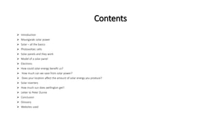 This document provides an overview of solar energy and how it works. It discusses solar power generation at Maungaraki School in Wellington, New Zealand, including statistics on the amount of energy generated by their solar panels. It also covers the basics of solar energy, how photovoltaic cells work to convert sunlight to electricity, how solar panels function, and the role of electrons. Additional topics include the benefits of solar energy, potential cost savings, solar cookers, how location can impact energy production, the purpose of solar inverters, and sunlight levels in Wellington. The document concludes with a sample letter advocating for solar power in New Zealand schools.
