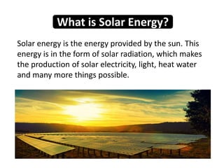 The document presents information on solar energy from Green University of Bangladesh, including that solar energy is energy from the sun that can be used to generate electricity, heat water, power technologies like satellites, and more. It discusses uses of solar energy such as generating electrical energy for devices, heating water, and solar drying applications. The advantages of solar energy are also outlined, such as being renewable and pollution-free, while disadvantages include the costs and inability to generate power at night.