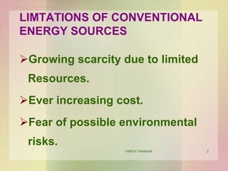 This document provides an overview of solar energy technology presented by Vanita Thakkar. It discusses the limitations of conventional energy sources and why solar energy is an important alternative. It then describes different types of solar energy utilization including direct conversion technologies like photovoltaics and solar thermal conversion systems. Photovoltaics convert sunlight directly into electricity using solar cells while solar thermal systems use collectors to convert sunlight into heat for applications such as water heating. Flat plate collectors and concentrating collectors are also discussed. The document provides details on various solar thermal power plants and technologies.