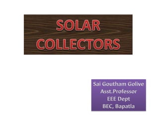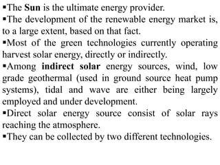 The document discusses solar energy, including the different types of solar technologies used to harvest energy from the sun. It notes that most green technologies currently operating harvest solar energy directly or indirectly. There are two main types of solar technology: solar thermal which captures the sun's heat, and photovoltaic solar technology which converts sunlight directly into electricity using solar panels. The document also discusses problems with solar energy availability and the types of solar collectors used.