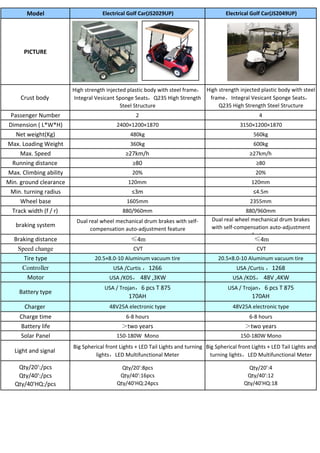 This document compares two electrical golf car models: the JS2029UP and the JS2049UP. The JS2029UP seats 2 passengers, has a net weight of 480kg, and maximum speed of 27km/h. The JS2049UP seats 4 passengers, has a net weight of 560kg, and maximum speed of 27km/h. Both golf cars have aluminum vacuum tires, Curtis controllers, KDS motors, Trojan batteries, and can be charged within 6-8 hours.